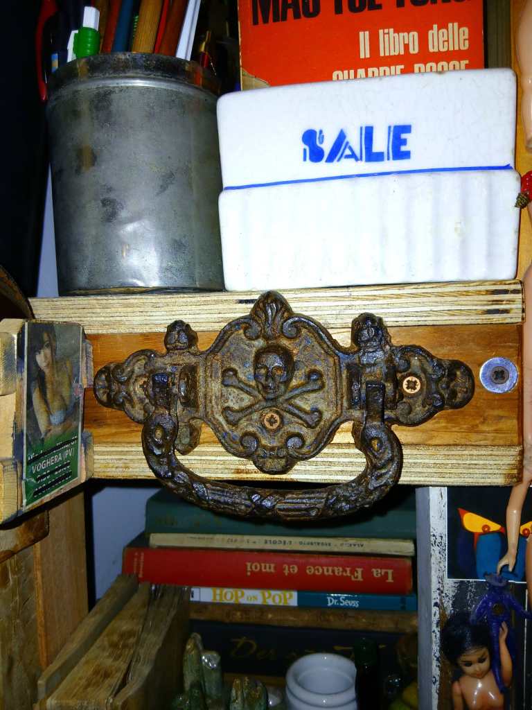 Due sono le cose, entrambe non in vendita: la prima è una maniglia da cassa da morto dell’800, raffigurante tra i vari fregi un piratesco teschio; la seconda è un cesso Richard Ginori primo 900 (con tanto di stemma della “Real Casa”), che ho incastonato in una delle librerie.