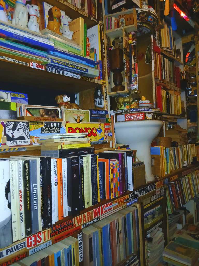 Fu così che nel dicembre del 2016 presi in affitto un buco di 17 metri quadri e senza soldi, ma con il garage pieno di qualsiasi cosa… costruii la prima bottega completamente con materiale di recupero e riempita con libri e cose raccolte in oltre 20 anni di mercatini e case abbandonate.